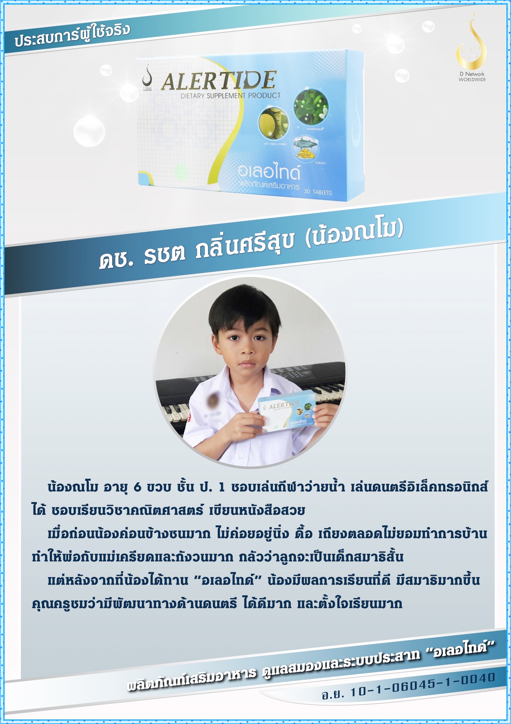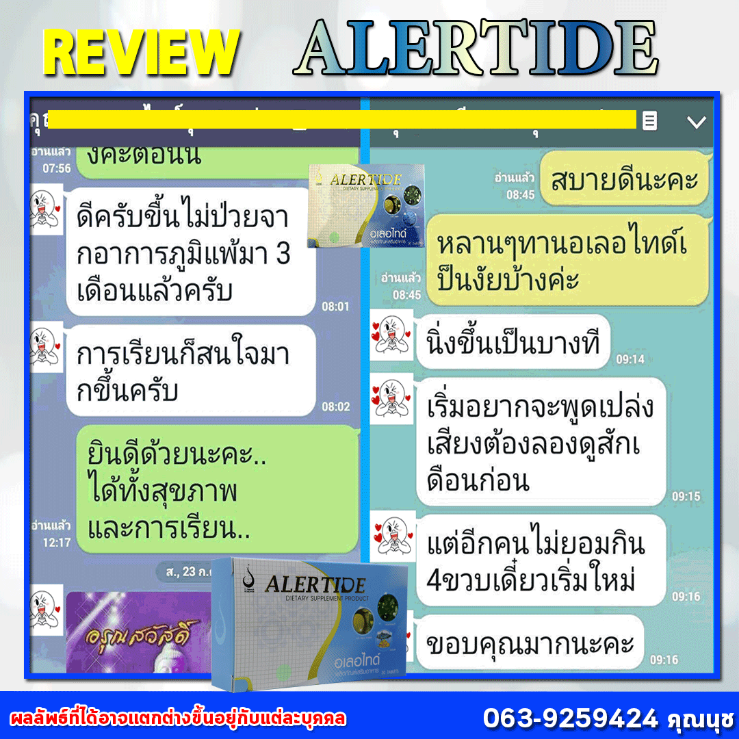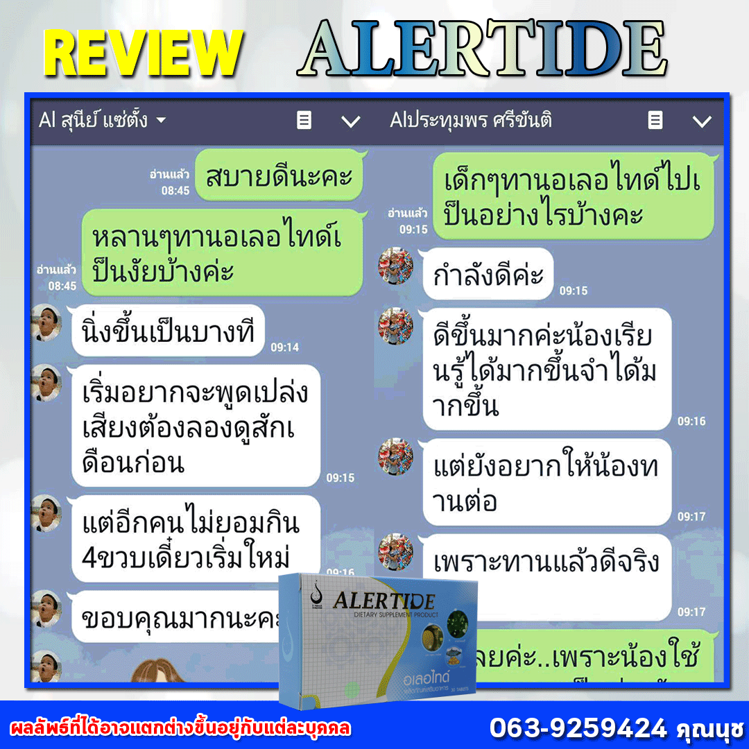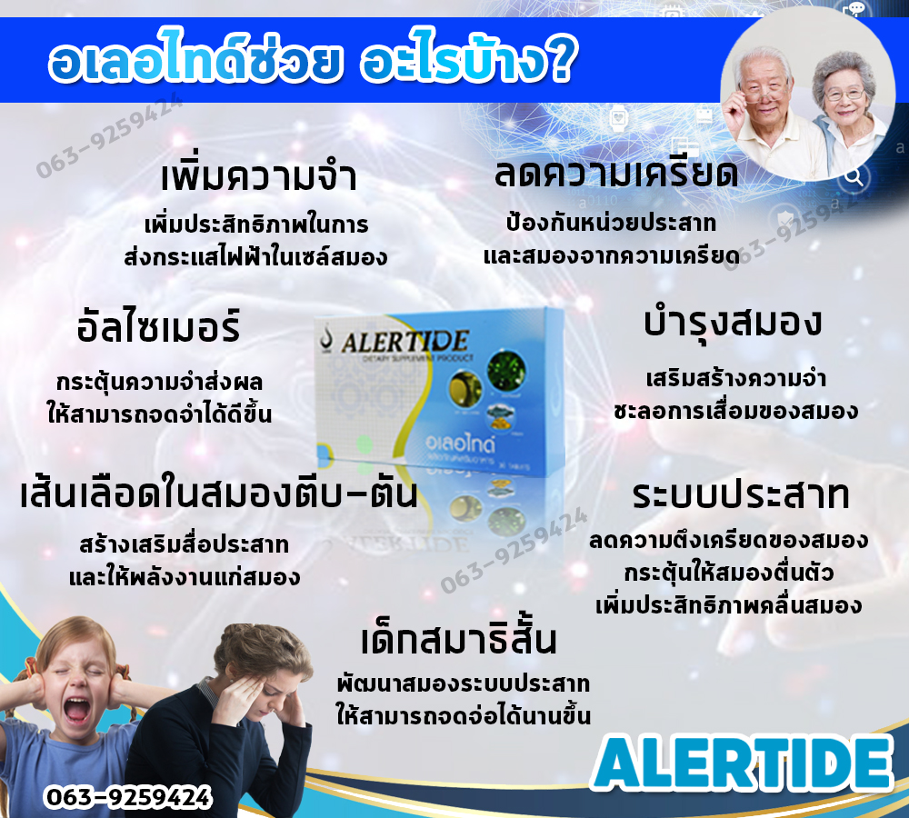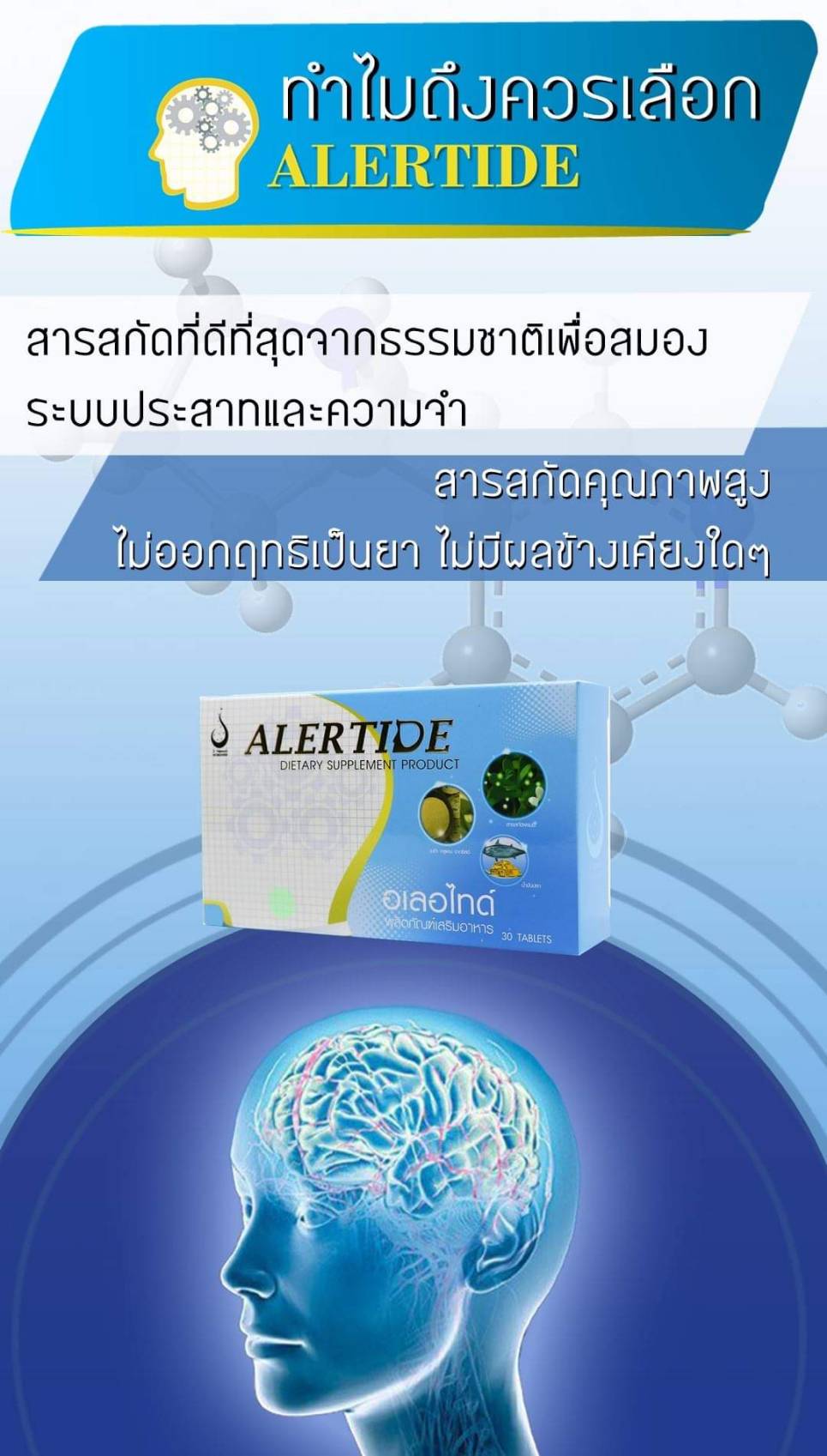 : ประกอบด้วย กรดไขมันโอเมก้า-3 ซึ่งแบ่งออกเป็น EPA และ DHA เป็นหลัก และกรดไขมันโอเมก้า6 ในAlertide(อเลอไทด์)จะเน้นเฉพาะน้ำมันปลาที่มีส่วนประกอบ DHA สูง ซึ่ง DHAนั้นมีส่วนสำคัญในการเพิ่มเยื่อไมอิลินในเส้นประสาท ทำให้มีประสิทธิภาพมากขึ้น ในการส่งกระแสไฟฟ้าในเซลล์ประสาทให้ดียิ่งขึ้น