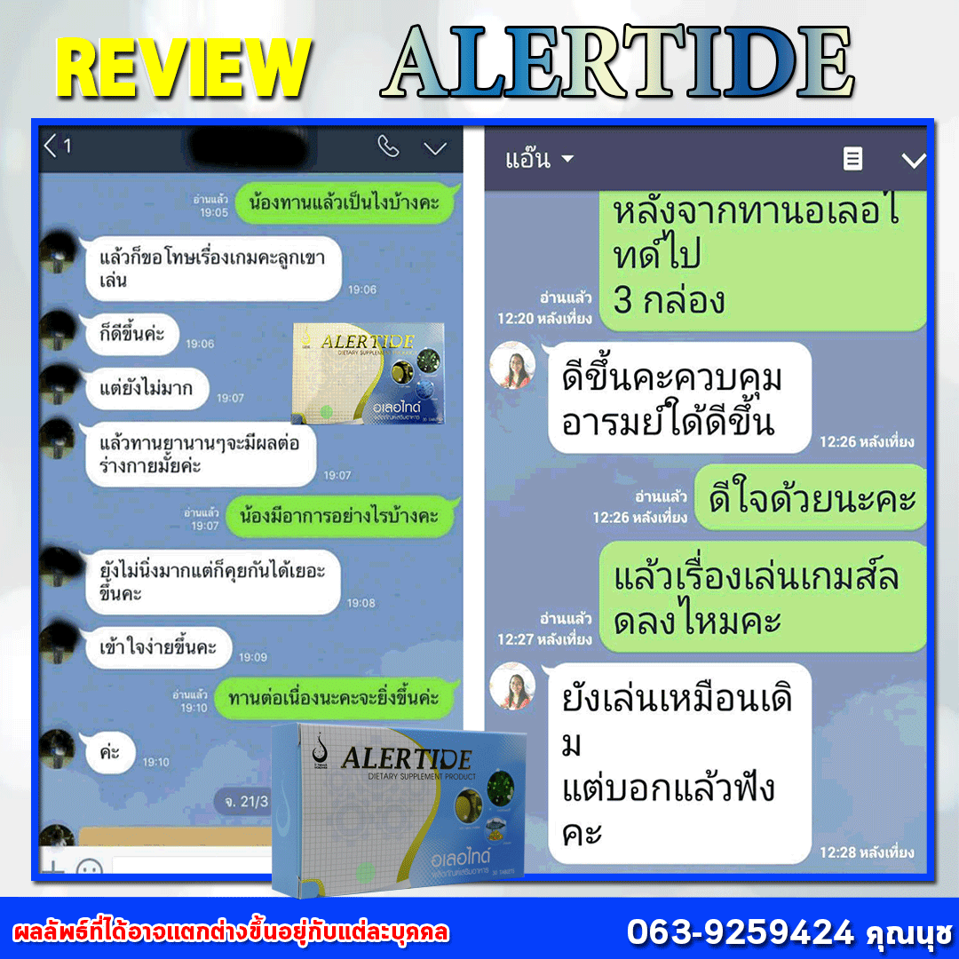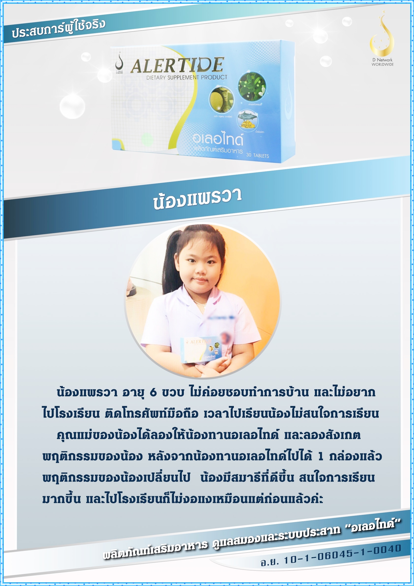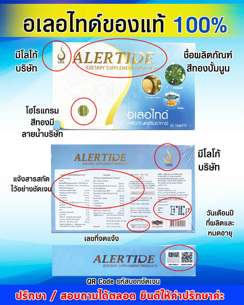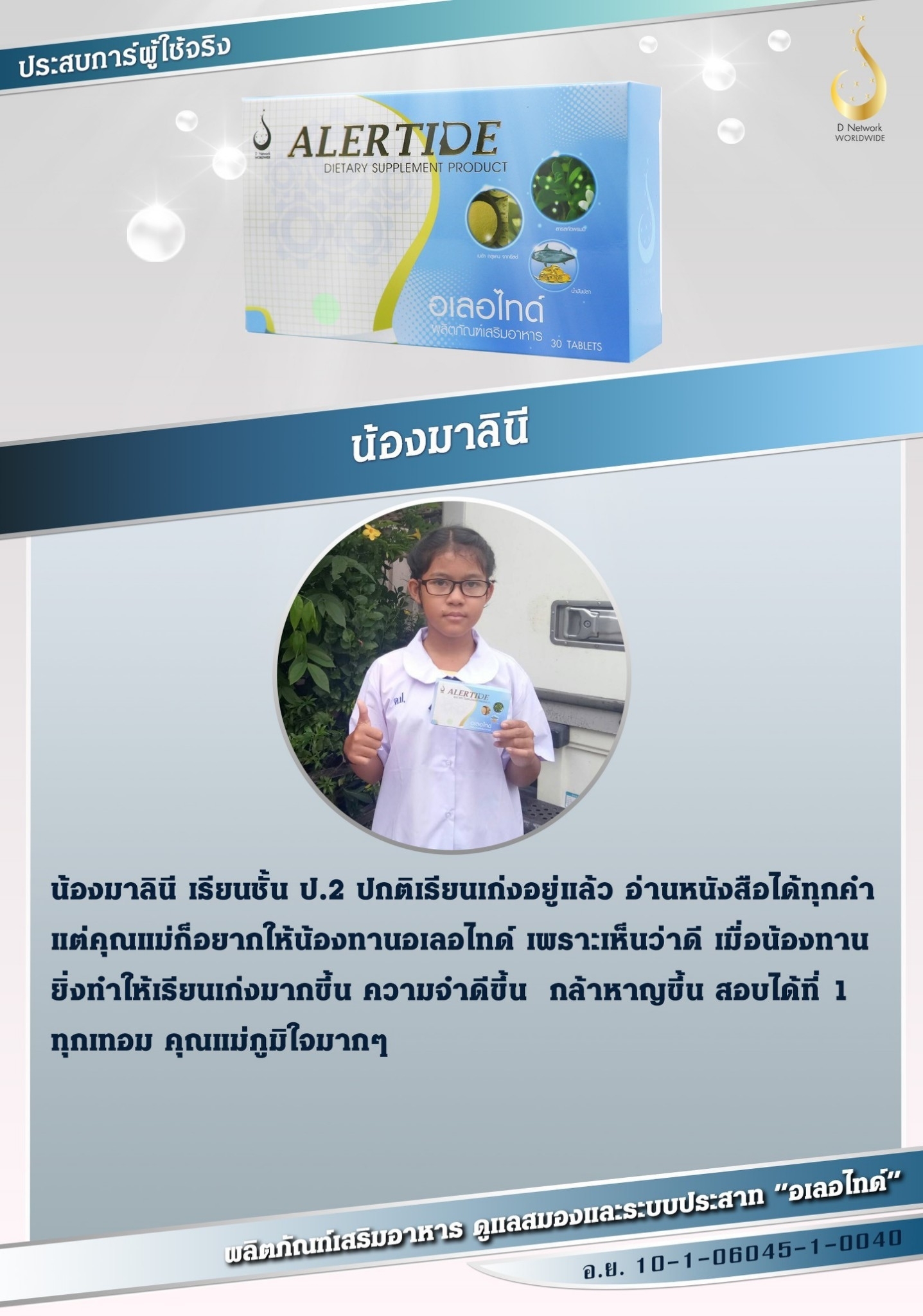 : ประกอบด้วย กรดไขมันโอเมก้า-3 ซึ่งแบ่งออกเป็น EPA และ DHA เป็นหลัก และกรดไขมันโอเมก้า6 ในAlertide(อเลอไทด์)จะเน้นเฉพาะน้ำมันปลาที่มีส่วนประกอบ DHA สูง ซึ่ง DHAนั้นมีส่วนสำคัญในการเพิ่มเยื่อไมอิลินในเส้นประสาท ทำให้มีประสิทธิภาพมากขึ้น ในการส่งกระแสไฟฟ้าในเซลล์ประสาทให้ดียิ่งขึ้น