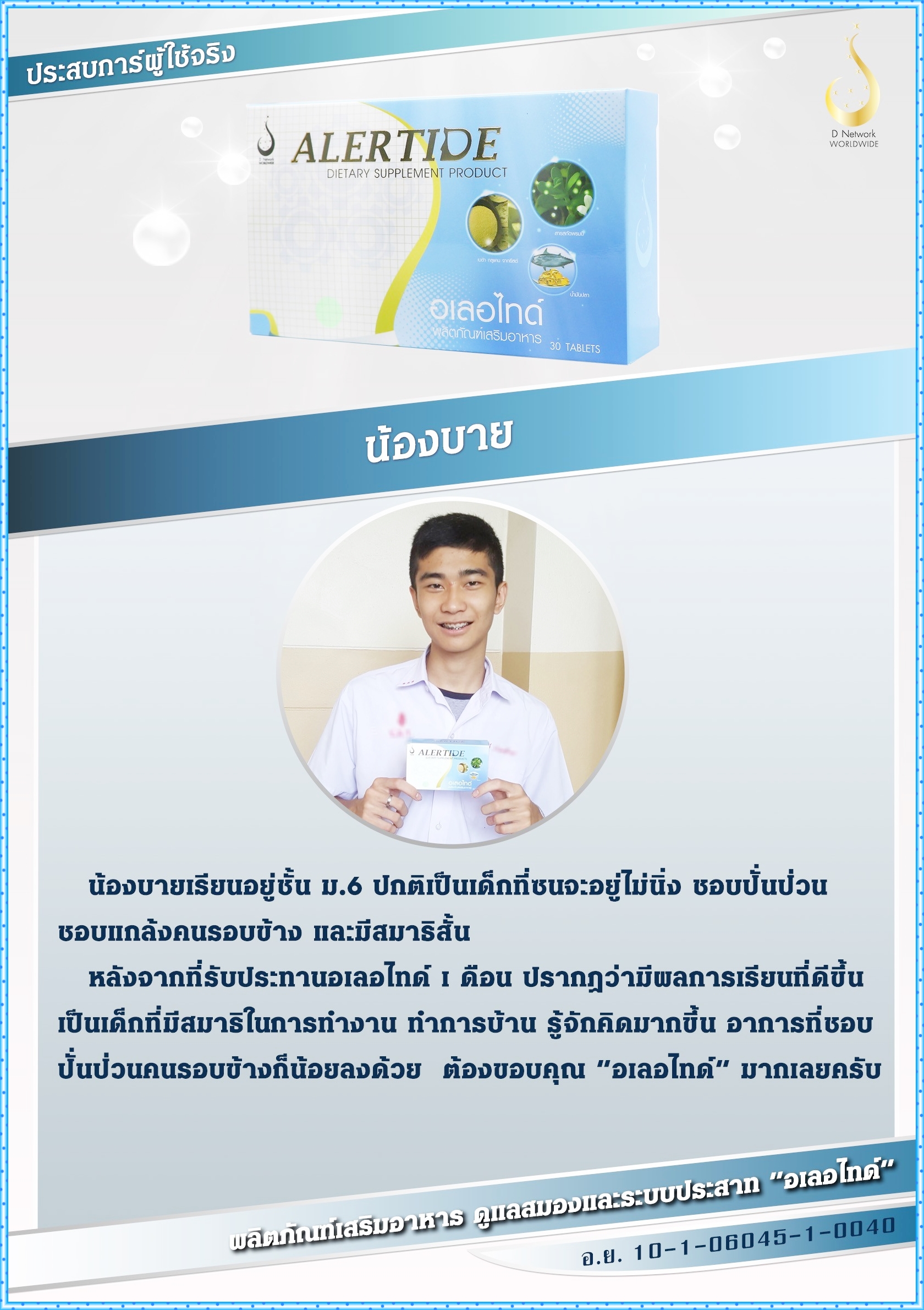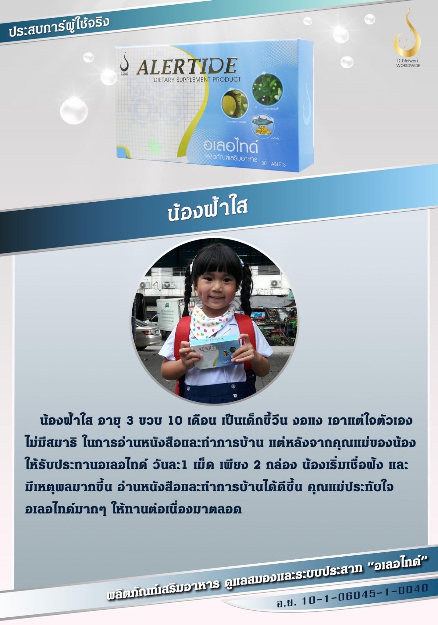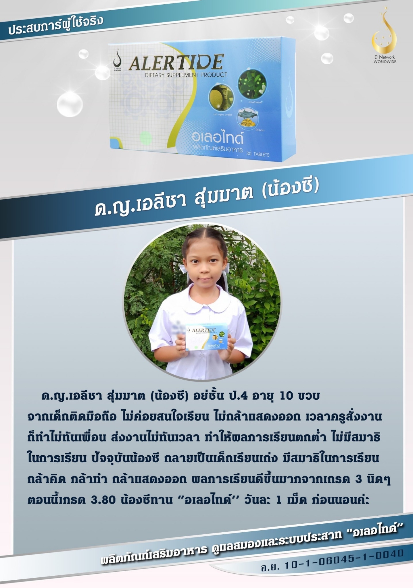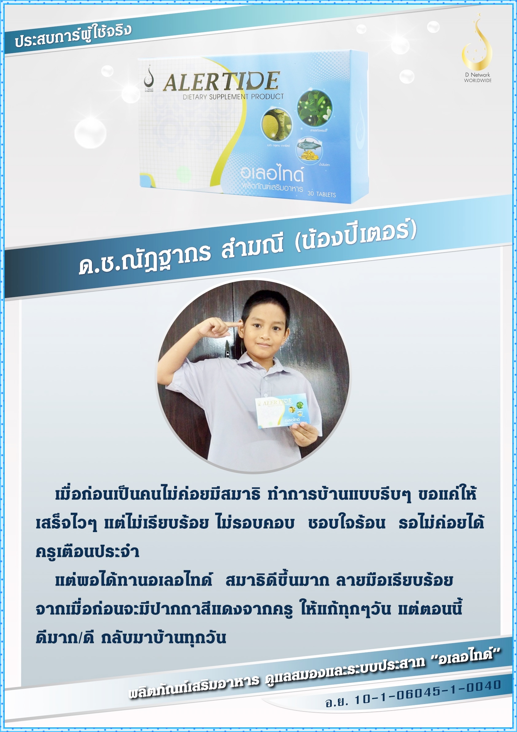 : ประกอบด้วย กรดไขมันโอเมก้า-3 ซึ่งแบ่งออกเป็น EPA และ DHA เป็นหลัก และกรดไขมันโอเมก้า6 ในAlertide(อเลอไทด์)จะเน้นเฉพาะน้ำมันปลาที่มีส่วนประกอบ DHA สูง ซึ่ง DHAนั้นมีส่วนสำคัญในการเพิ่มเยื่อไมอิลินในเส้นประสาท ทำให้มีประสิทธิภาพมากขึ้น ในการส่งกระแสไฟฟ้าในเซลล์ประสาทให้ดียิ่งขึ้น