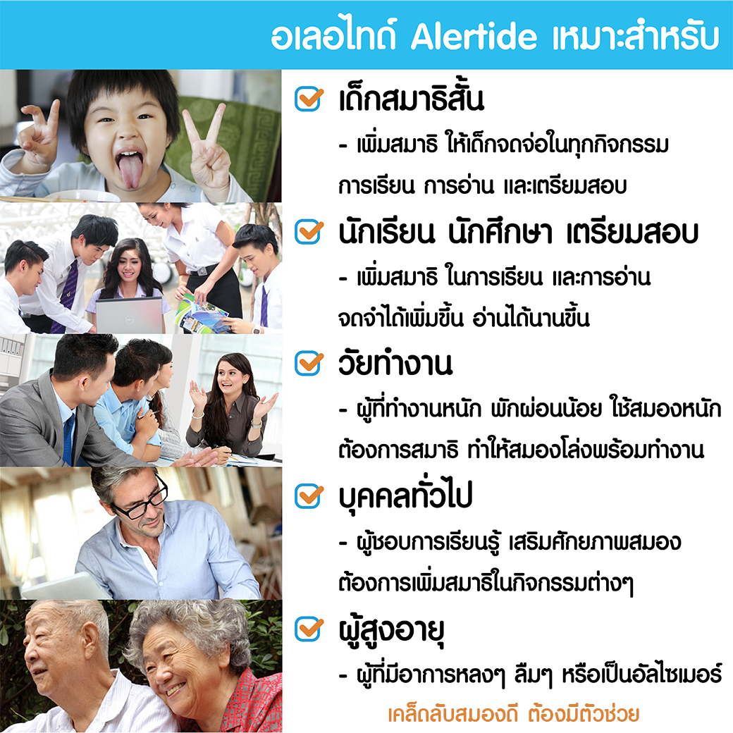 - เหมาะสำหรับนักเรียน นักศึกษา ผู้ที่ทำงานที่ต้องใช้สมองอย่างหนัก ผู้ที่มีอาการสมาธิสั้น ผู้ที่มีอาการ ความจำเสื่อม ผู้สูงอายุ